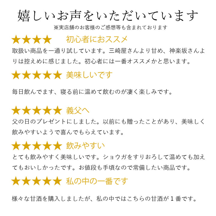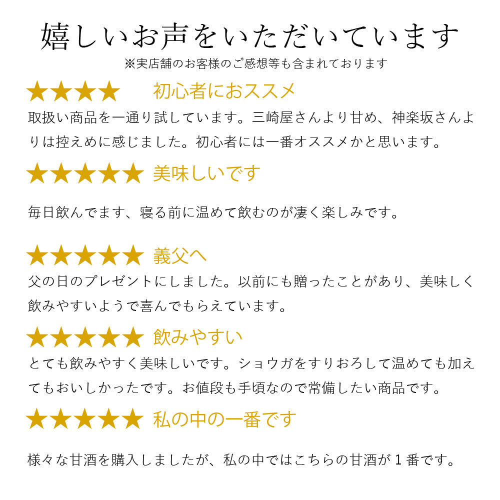 シンプルだからこそ美味しい!米麹のうま味がぎゅっと詰まった甘酒です。お好みで生姜を加えると味がさらに引き立ちおすすめです。