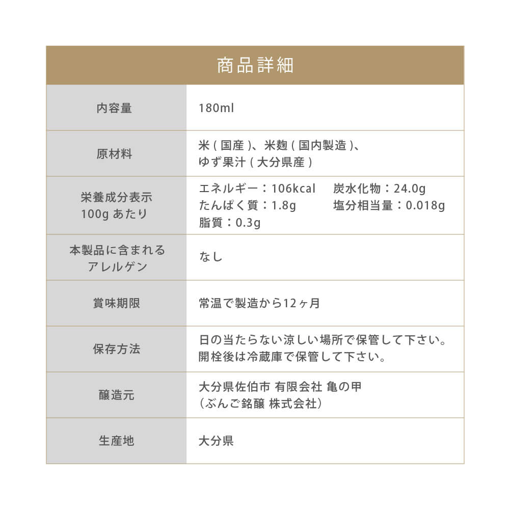 大分県佐伯市の美味しいお水と米を使い、砂糖や添加物を一切使わず米と米麹だけで作り上げた昔ながらの甘酒に、大分県産のゆず果汁を加えることで、ほろ苦さと甘酸っぱさを感じるさっぱりとした味わいに仕上げました。