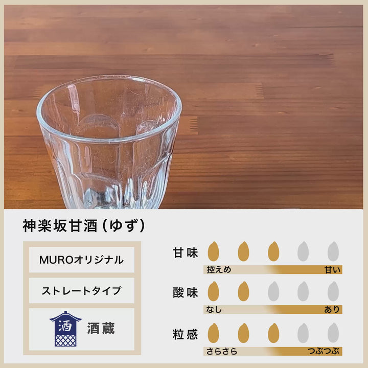 MURO神楽坂オリジナル甘酒のゆず味です。大分県産のゆず果汁を加え、ゆず本来のほろ苦さと甘酸っぱさを込めました。どんな方にも好まれる人気の甘酒です。温かくしても冷たくしても、どちらでも美味しくお召し上がりいただけます