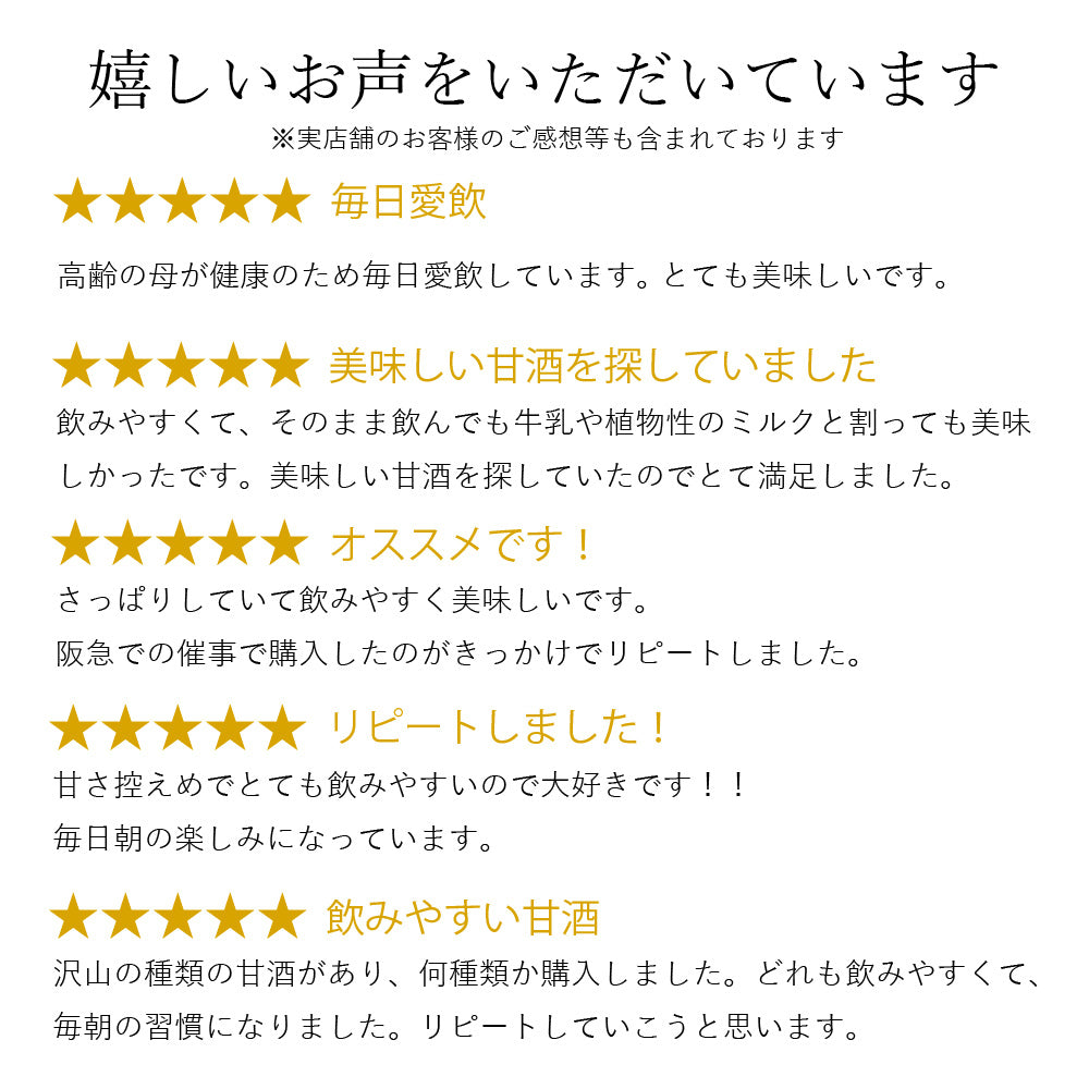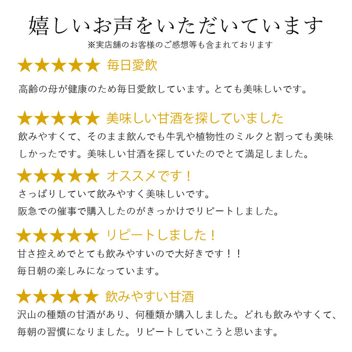 飽きの来ない程よい甘さと旨さが特徴の、サラッとした飲み心地の甘酒です。