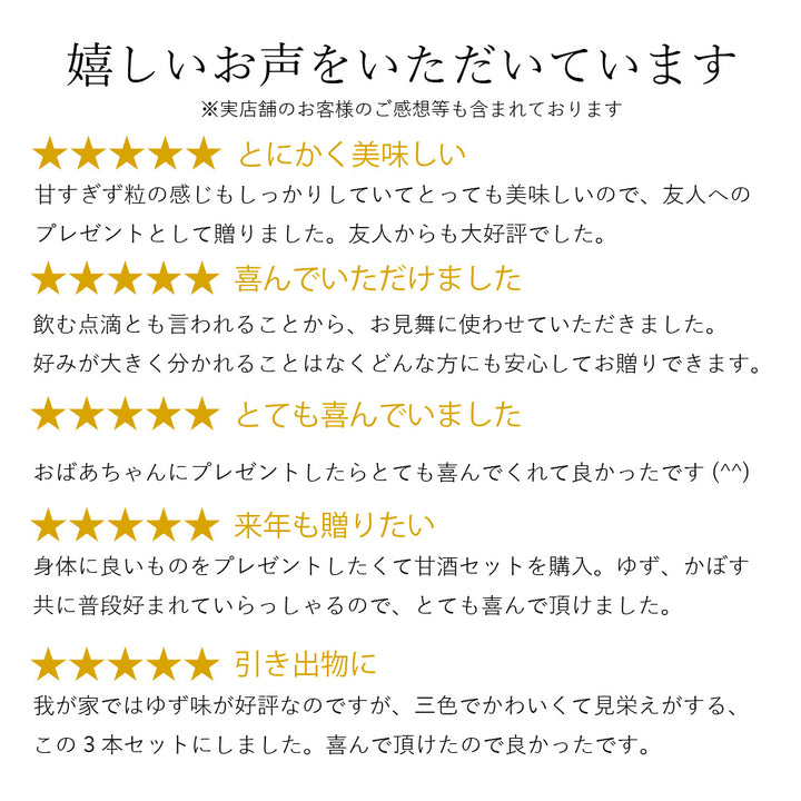 当店オリジナルの甘酒です!プレーンの米麹甘酒本来の優しい甘さ、ゆず本来のほろ苦さと甘酸っぱさ、かぼすの程よい酸味とさっぱりとした味わいを飲み比べられる楽しいセット。ノンアルコール、ノンシュガーなのでお子様から妊婦さん、ご年配など、どなたでも美味しく飲むことができるのも、元気の贈り物として喜ばれるポイントです♪。