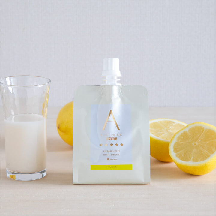 「KOJI DRINK A」をベースに天然レモン果汁を加えた甘酒は、胃に負担をかけない植物性由来の食材で作られています。