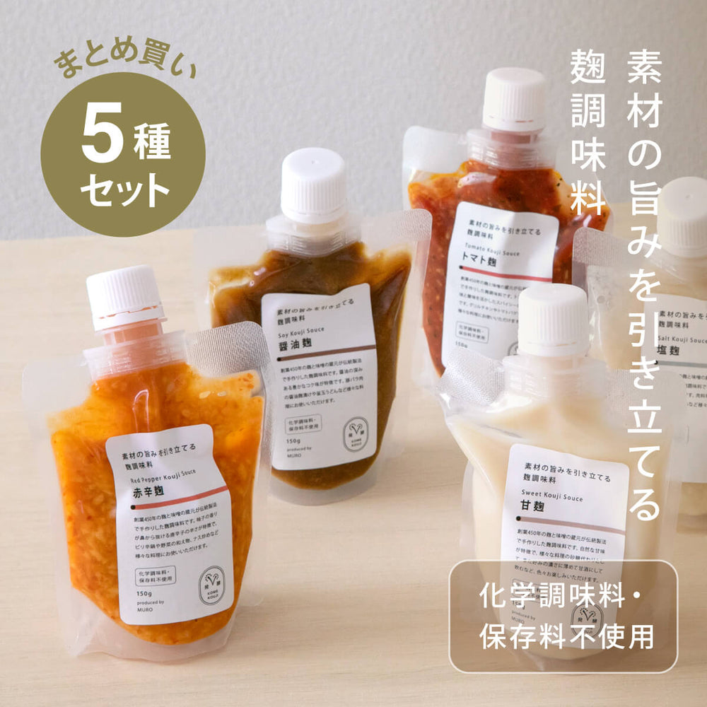 トマト麹、赤辛麹、塩麹、甘麹、醤油麹の5種類×各1個のセット。